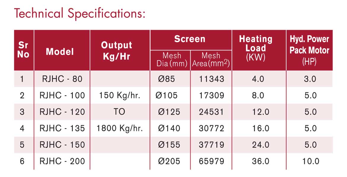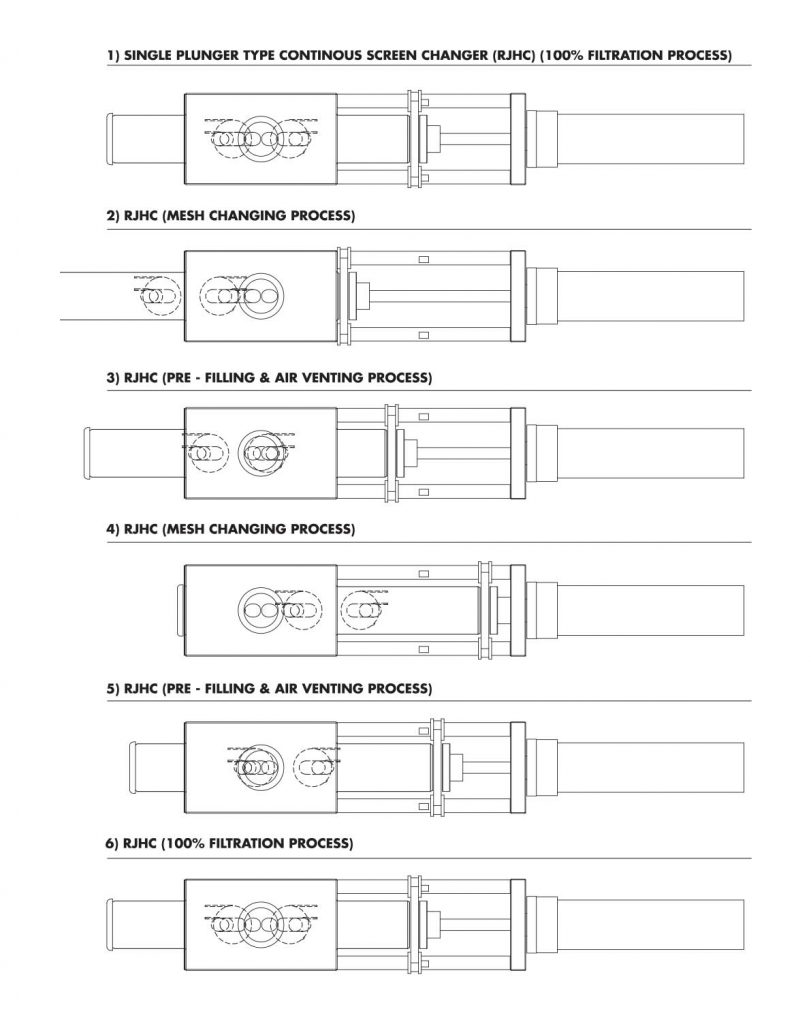 The Basic constructions of this screen changer are having two screen cavities so melt flow passes 100% to output after filtration and 50% during one cavities under mesh changing operation considering double filtration area.